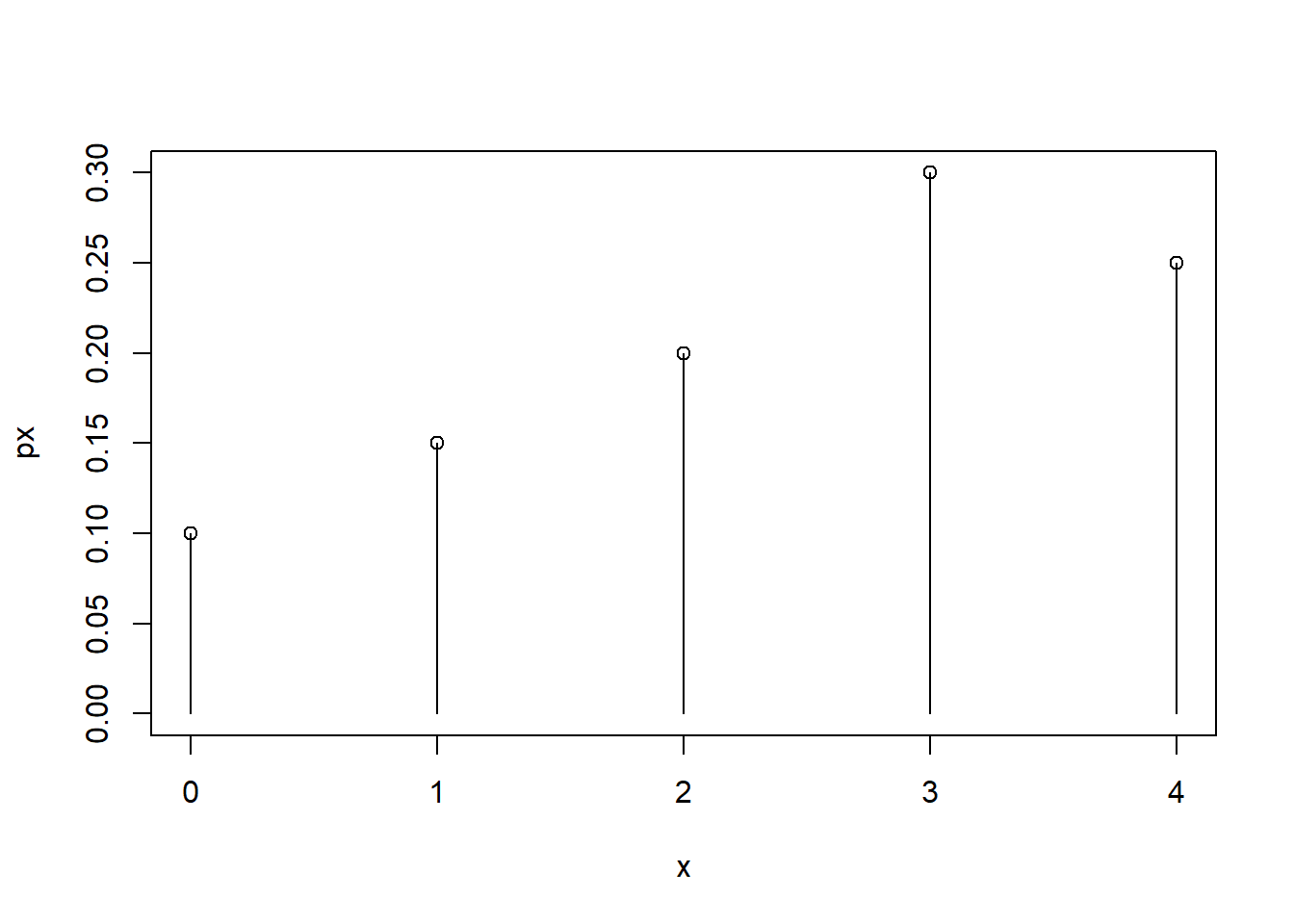 px <- c(.10, .15, .20, .30, .25)4 Probability and Random Variable R Examples