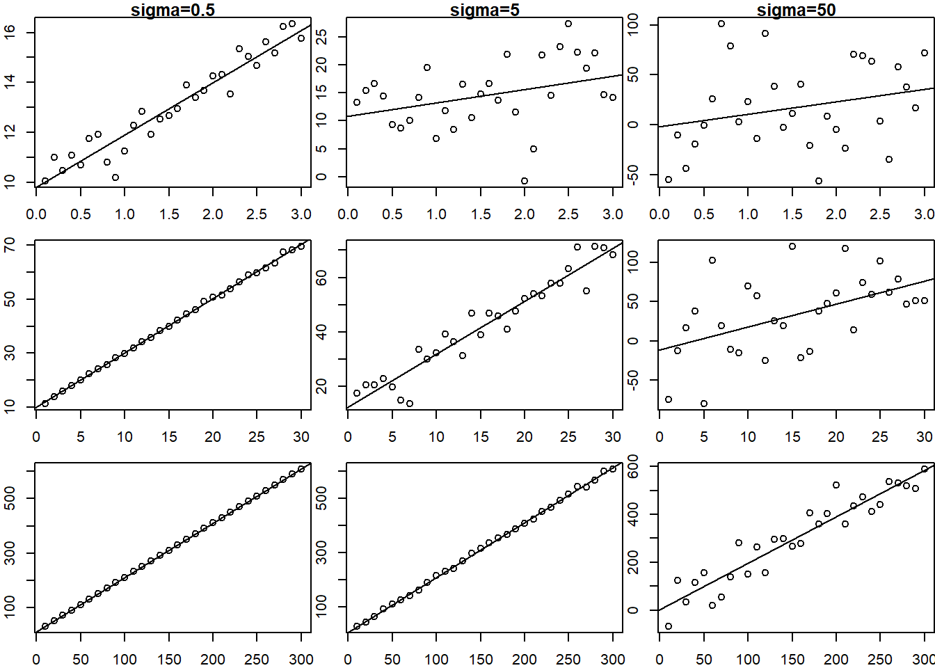 Y <- 10 + 2 * X + rnorm(length(X), 0, sd=5*scalar[j])