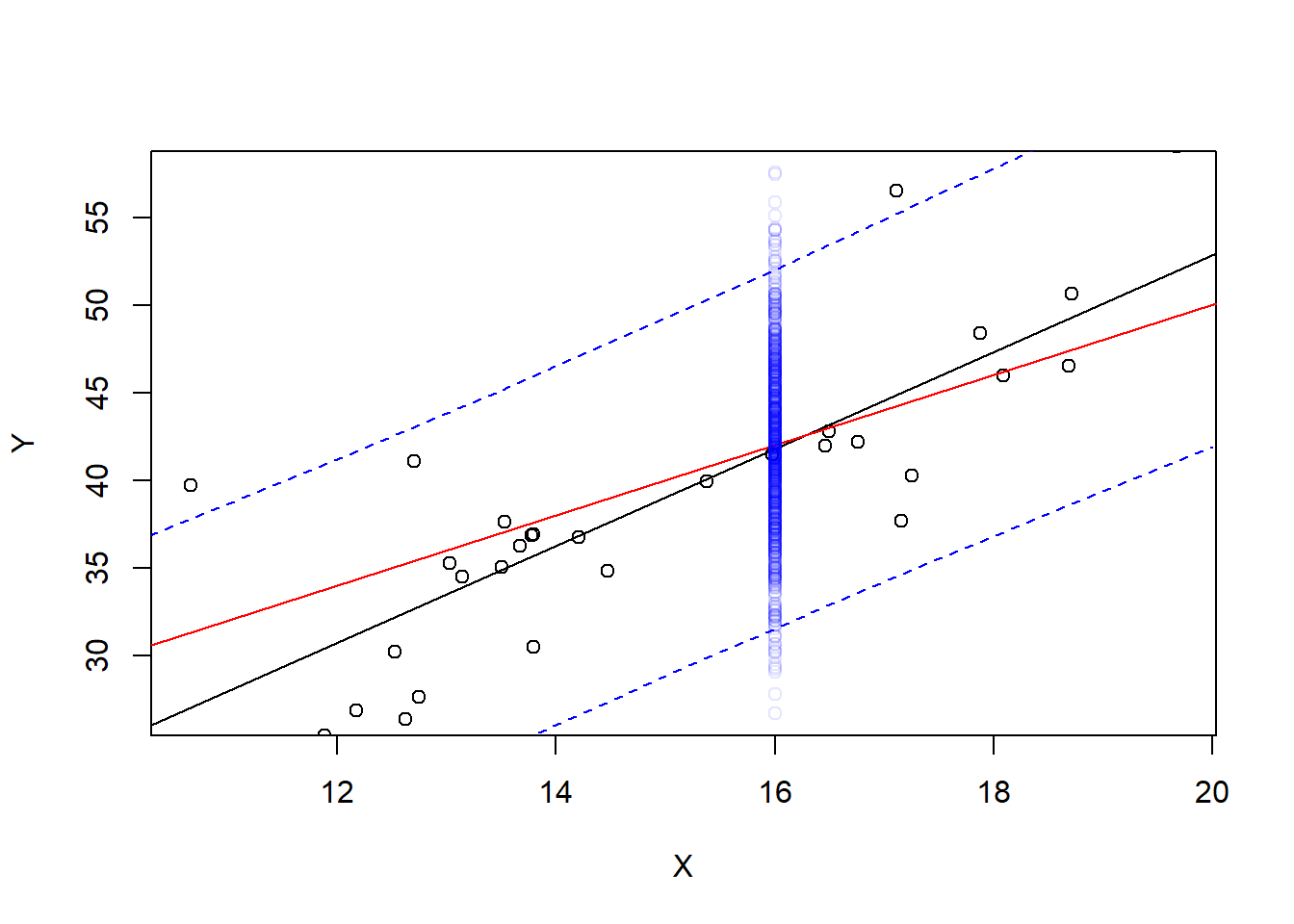 For example, take \(x=16\). What is the 95% confidence interval for \(E(\hat Y|X=16)\)?