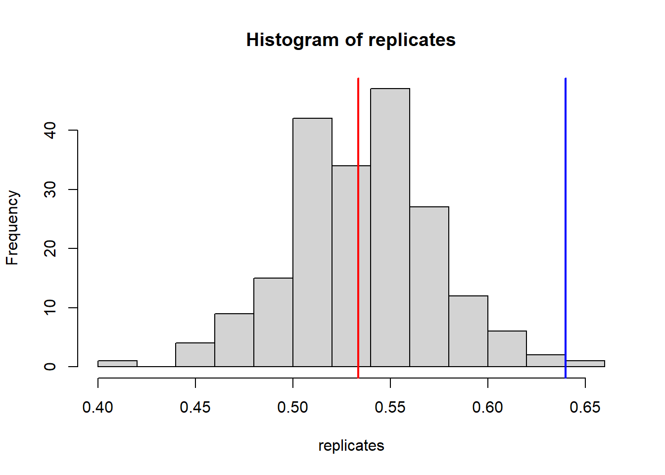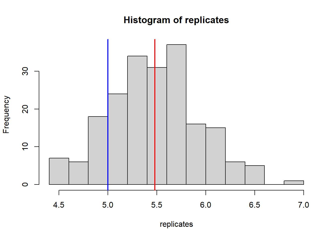 Now, replicates is a vector of (approximate) replicates of our estimate for \(\lambda\). Let’s visualize the replicates– we’ll indicate the true \(\lambda\) in blue and our estimate (lambdahat) in red.