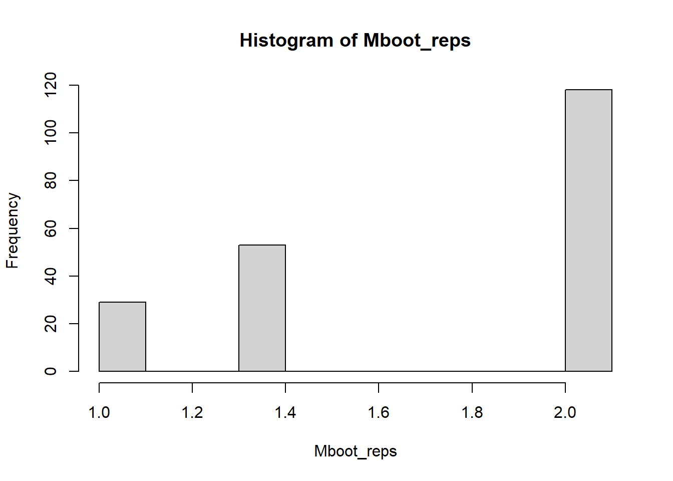 successes[i] = run_bootstrap_expt( 200 ); # Using B=200 replicates.