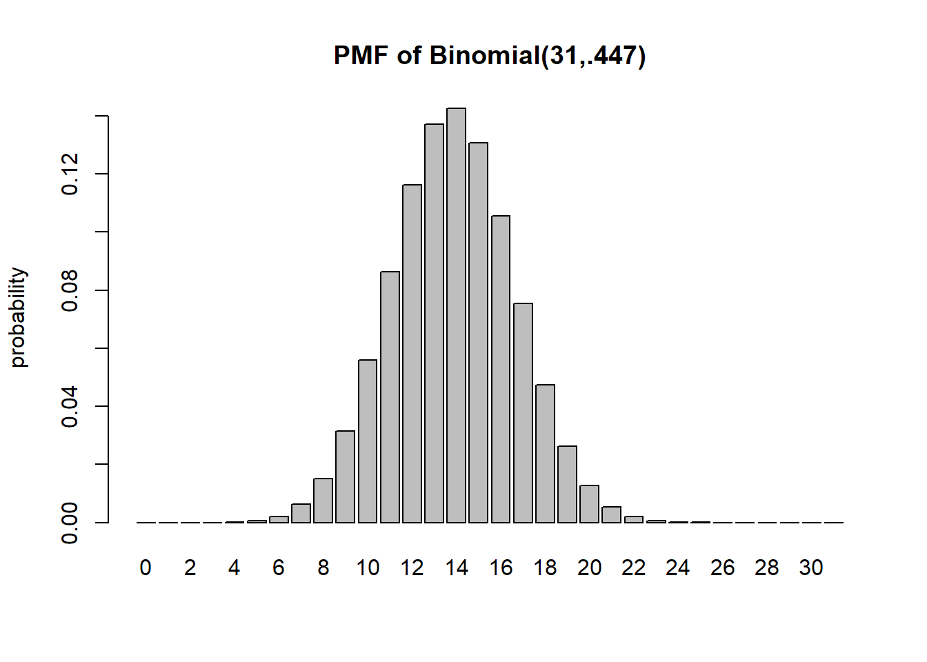 Assuming independence in sampling, and a representative sample, we can use a Binomial distribution with \(n=31\) and \(p=0.447\).
