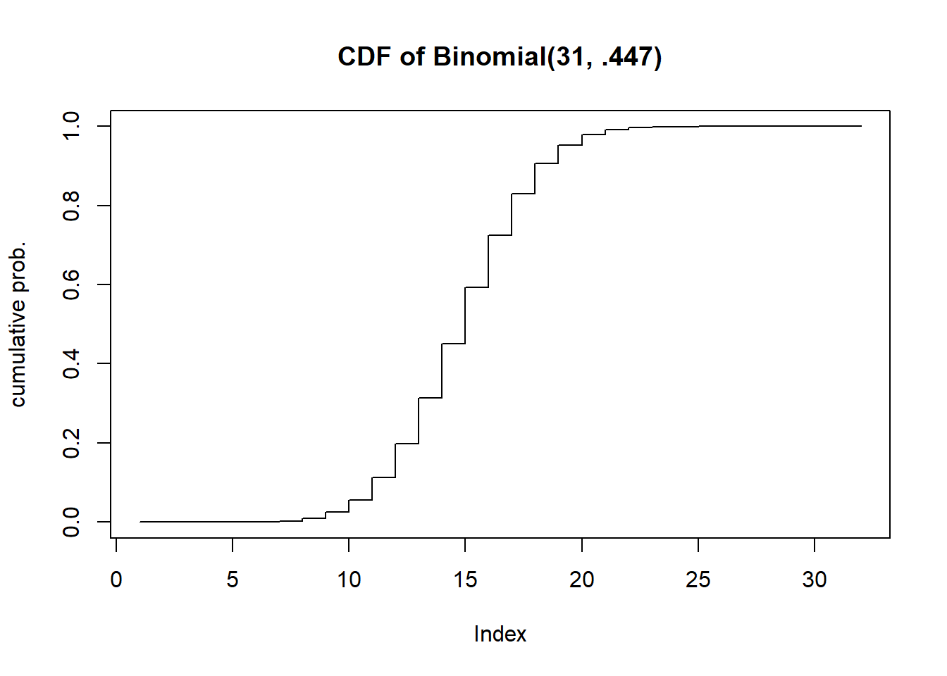 plot(pbinom(0:31, 31, .447), type="s", ylab="cumulative prob.", main="CDF of Binomial(31, .447)")