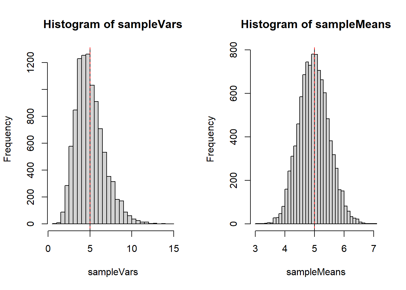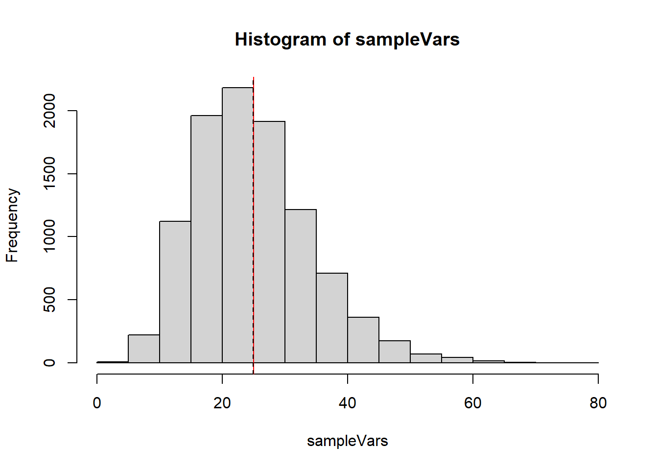 sampleVars <- replicate(10000, var(rnorm(15, 10, 5)))
