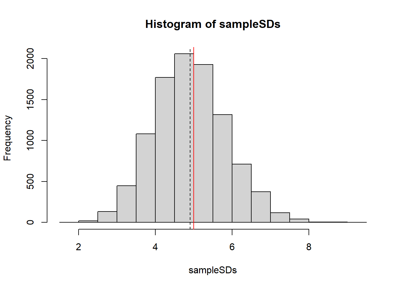 sampleSDs <- replicate(10000, sd(rnorm(15, 10, 5)))