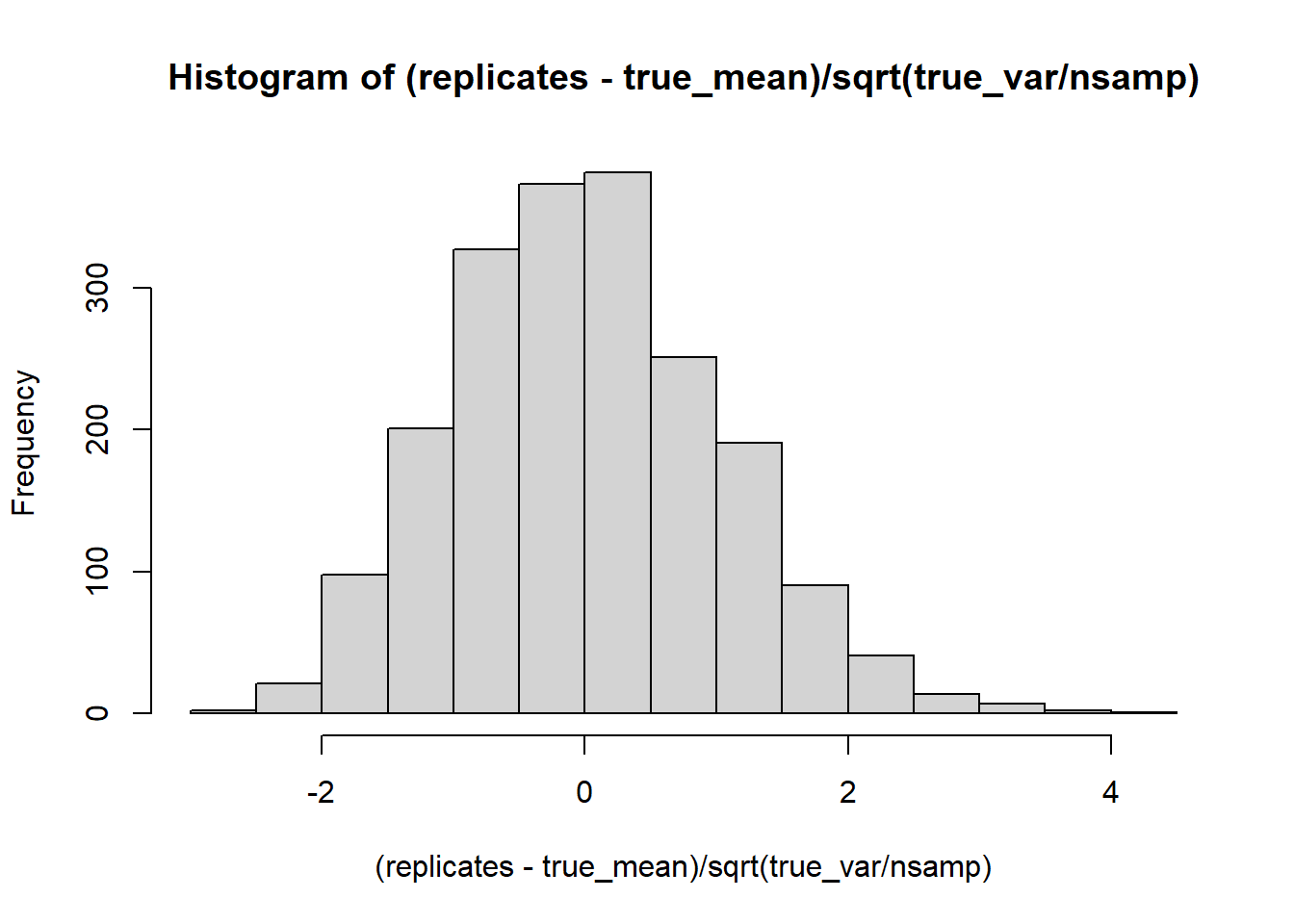 Exercise: repeat the above experiment with a different data distribution and see how large \(n\) has to be for the CLT to look like a reasonably good distribution. If you play around enough with different distributions and different choices of parameter values, you should be able to find two different data distributions that have decidedly different behavior in terms of when the centered, rescaled sample mean starts to “look” normal.