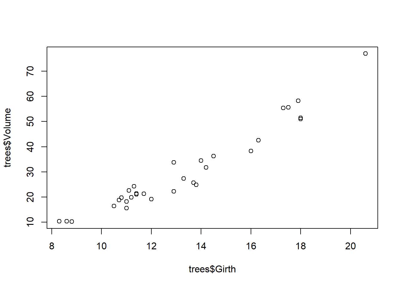 The trees data set in R contains measurements of diameter (in inches), height (in feet) and the amount of timber (volume, in cubic feet) in each of 31 trees. See ?trees for additional information.