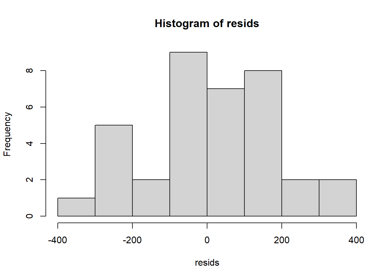 That looks… okay, at any rate. The residuals are (approximately) symmetric about zero, and the histogram looks normal-ish to me. We’ll come back to this point, and later in your studies (e.g., if you take our department’s regression course) you’ll learn lots of ways for assessing model fit (e.g., checking if the normal errors assumption is correct), but for the time being, we’ll be satisfied with the “ocular inspection” method.