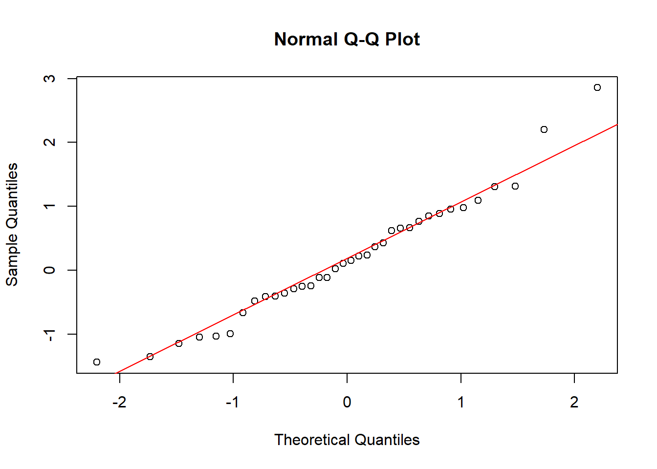 The stronger assumption, not required by linear regression per se, but a good assumption to check for use in downstream testing procedures (we’ll talk about that soon!), is that the errors are normal with mean zero. We saw that their histogram above looked pretty reasonable. A better check for fit is to construct a Q-Q plot (still no relation to the Chinese restaurant on University Ave, sadly).
