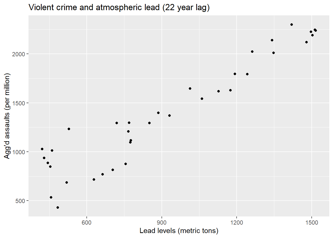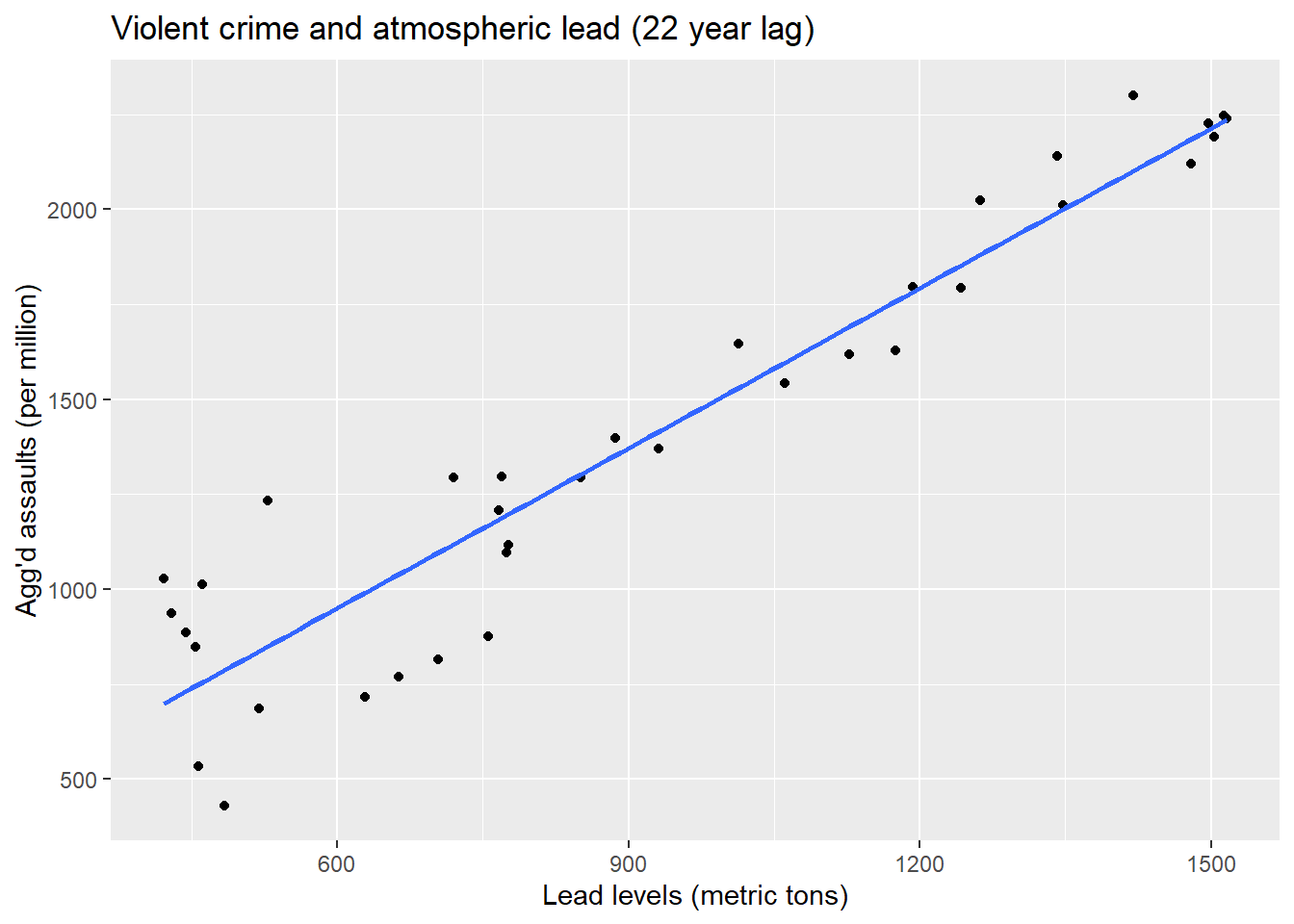 In this case, our p-value associated with \(\beta_1\) is quite small, indicating a correlation between lead levels and aggravated assault levels. It does not imply causation, though, as you well know by now. Nonetheless, this seems to be fairly convincing evidence that there is an association.