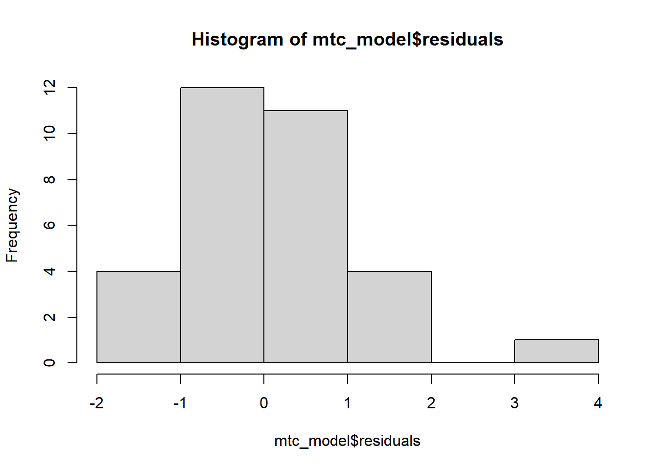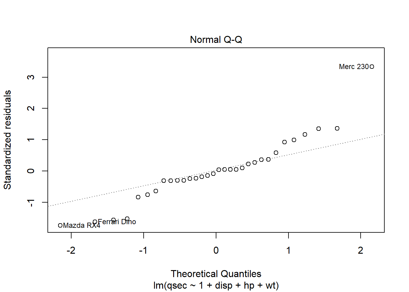 hp -0.022953 0.004603 -4.986 2.88e-05 wt 1.485283 0.429172 3.461 0.00175 ** — Signif. codes: 0 ‘’ 0.001 ’’ 0.01 ’’ 0.05 ‘.’ 0.1 ’ ’ 1