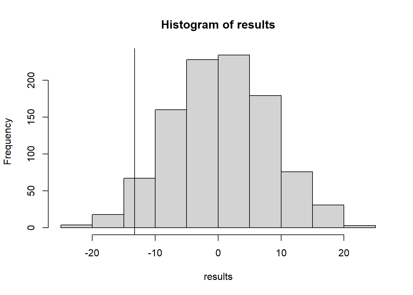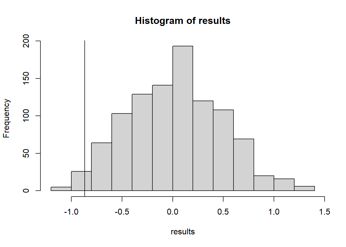 The question is whether this observed difference is statistically significant. We do not want to rely on the assumptions needed for the normal or t-distribution approximations to hold, so instead we will use permutations.
