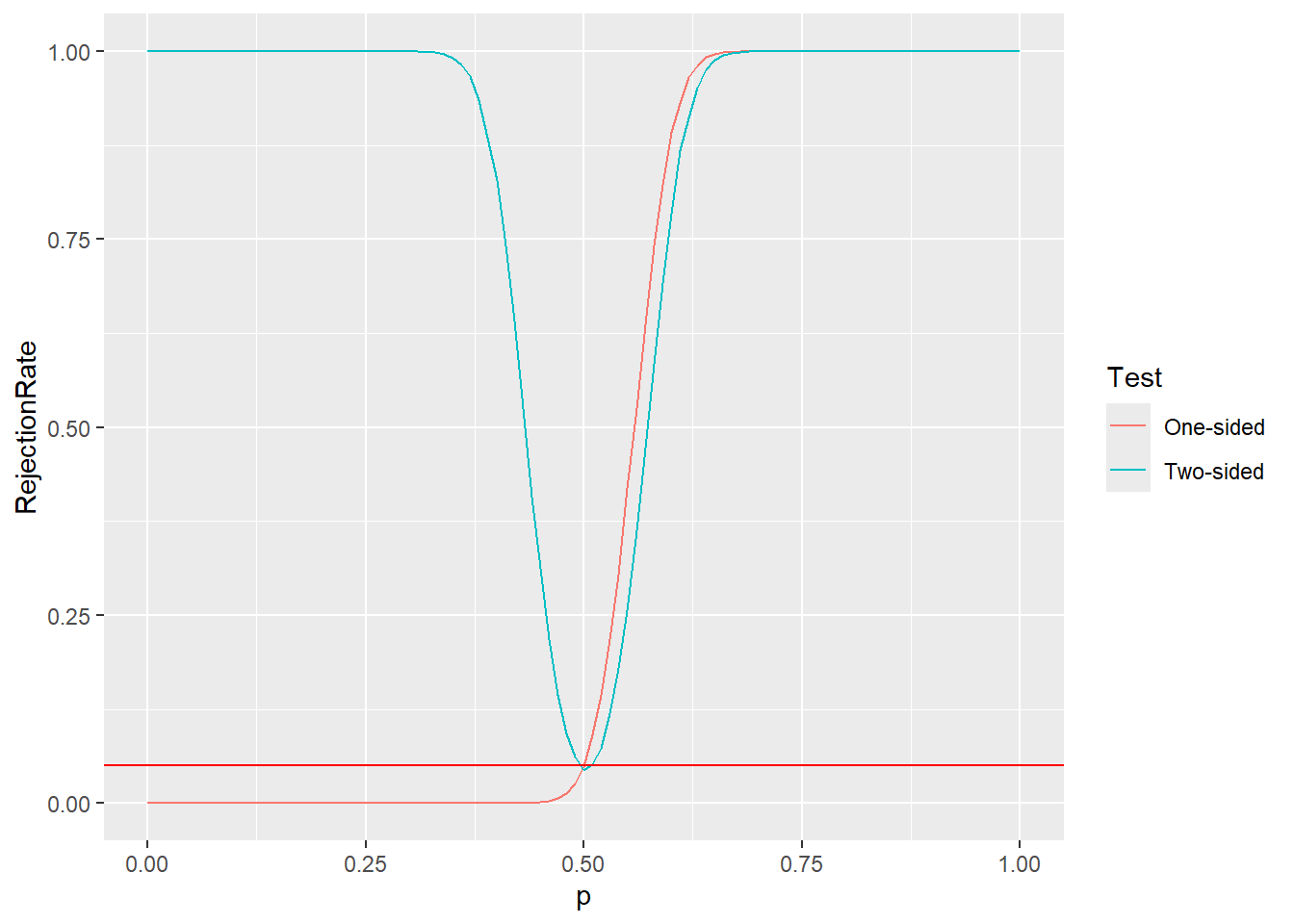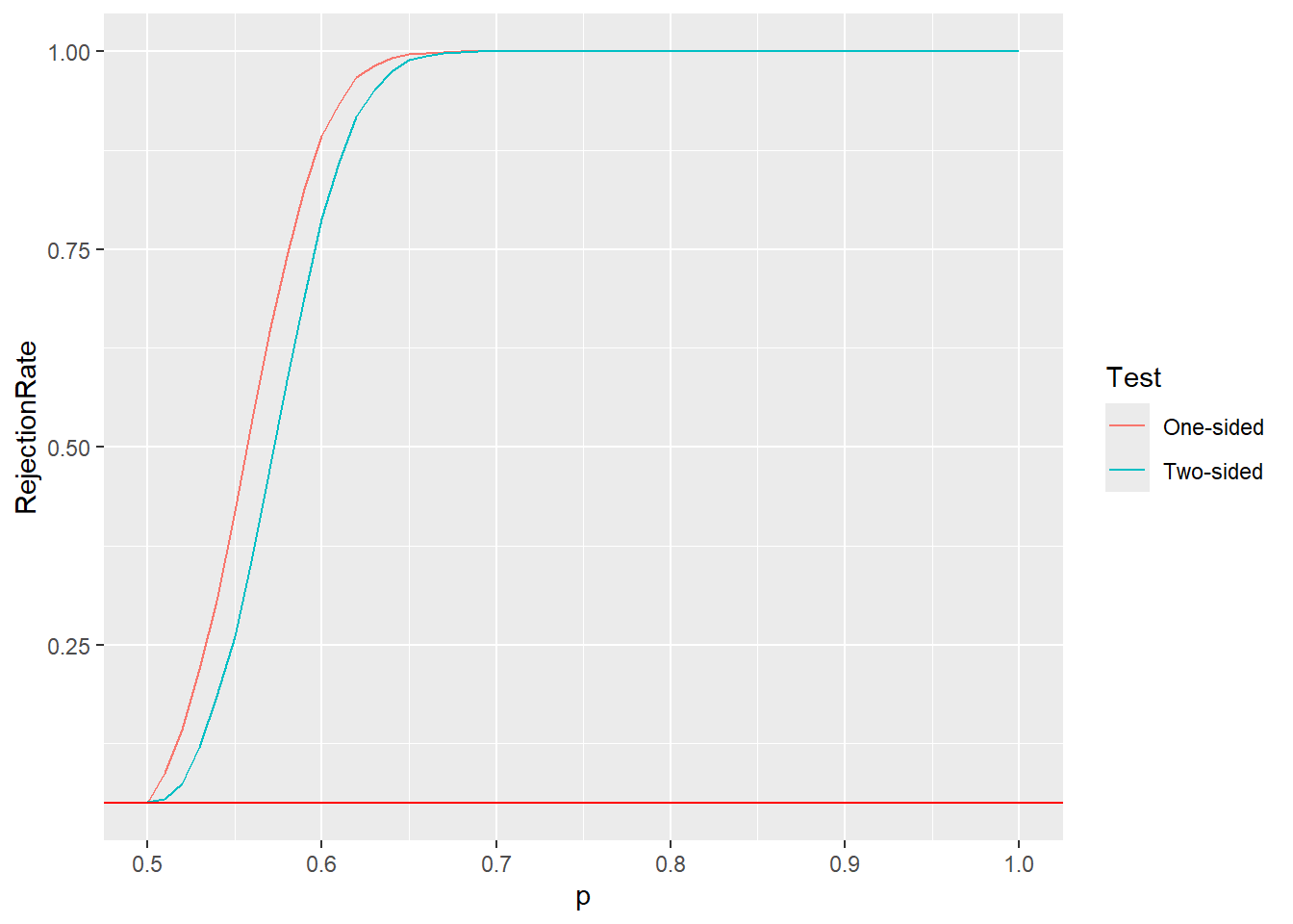 So we see that the one-sided test is more likely to (correctly) reject compared to the two-sided test when \(p > 1/2\).