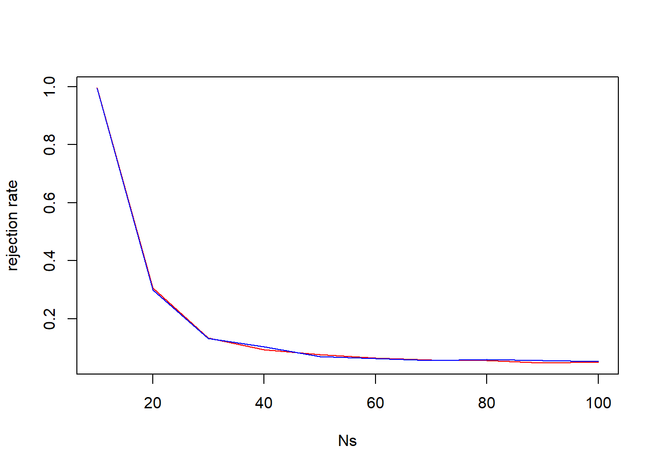 plot(x=Ns, y=rr1, type="l", col="red", ylab="rejection rate")