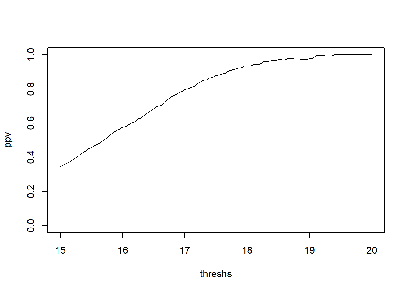 Create a plot of positive predictive power for thresholds of 15 to 20. ::: {.callout-note collapse=“true” title=“Solution”}