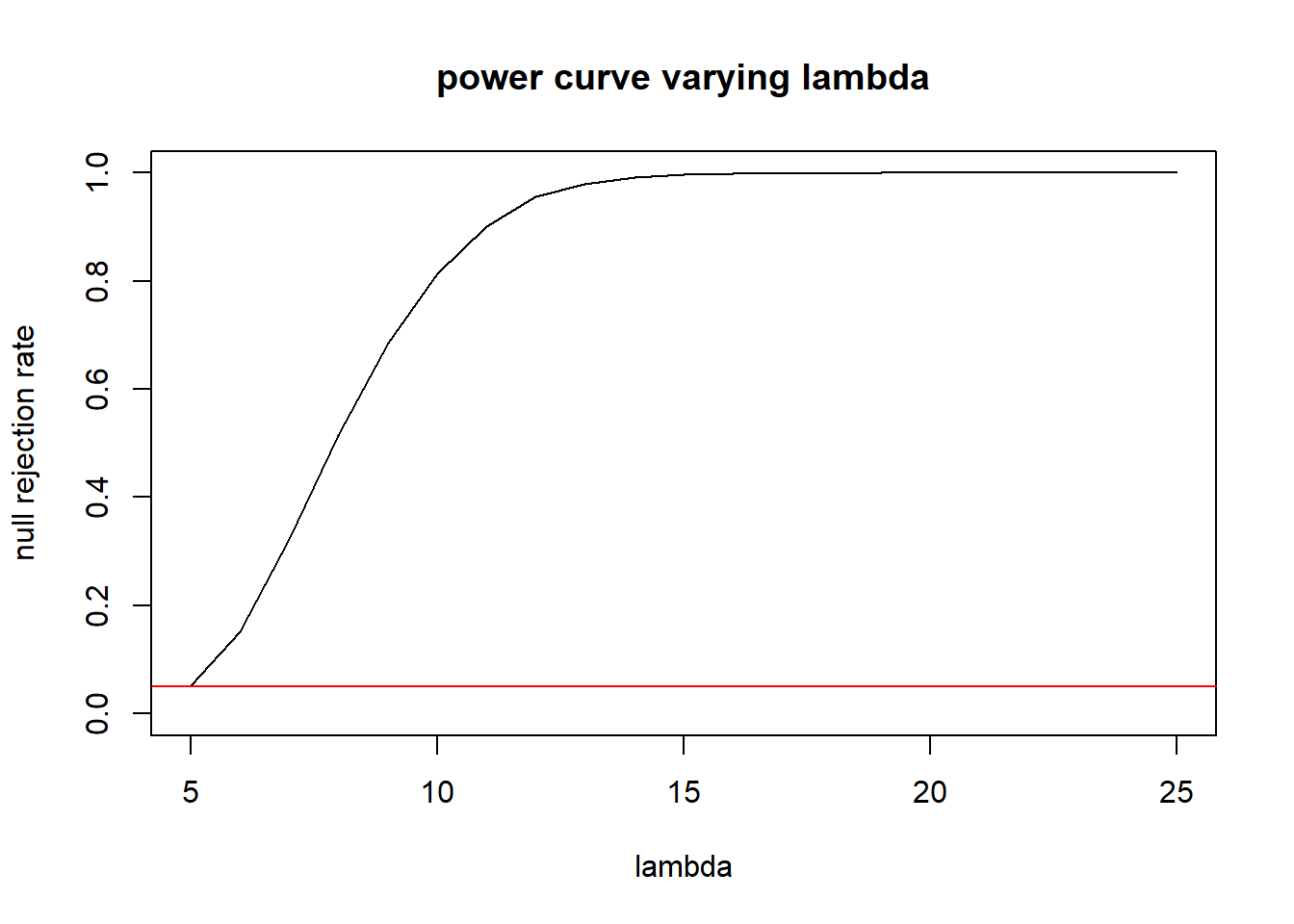Take \(\lambda_A\) values from 5 to 25, by 1s. Using the rejection rule you chose in part b, calculate the power of the test if the true lambda is \(\lambda_A\) and the sample size remains at 15.