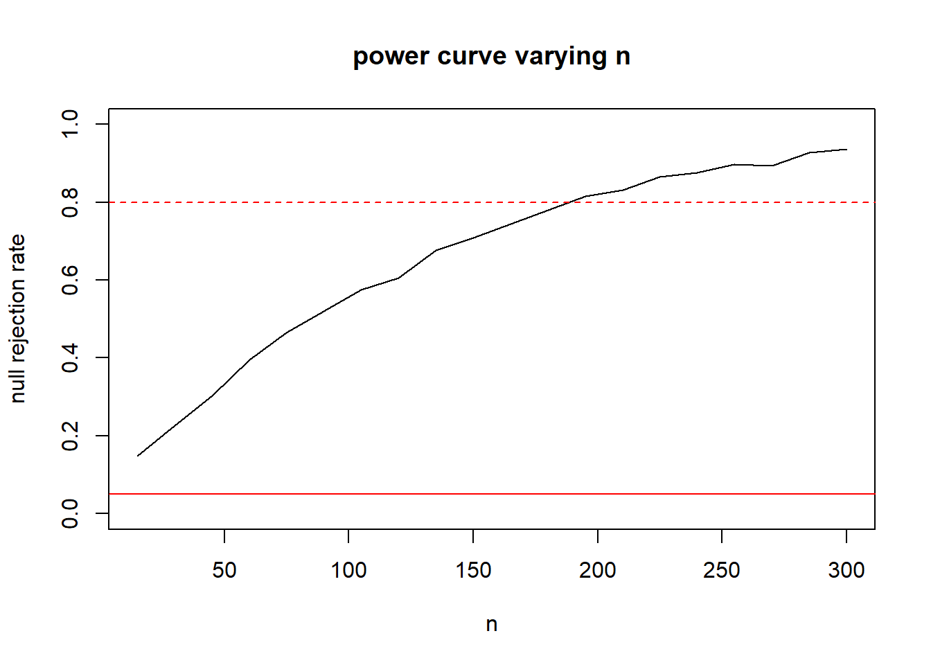plot(x=ns, y=rr, type="l",ylab="null rejection rate", xlab="n", main="power curve varying n", ylim=c(0,1))