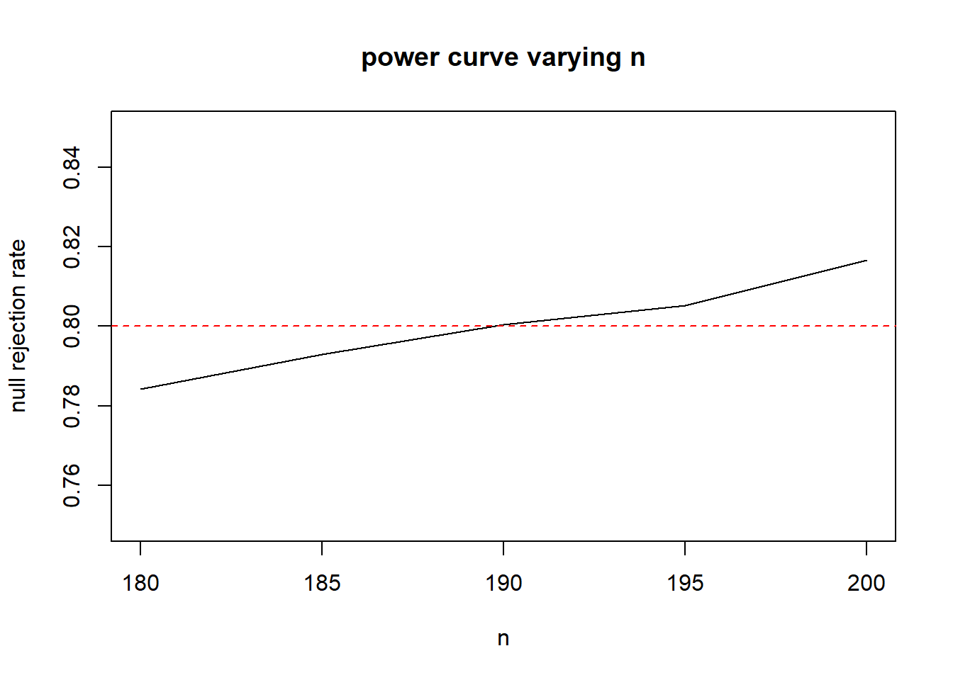 Increasing the number of replicates, and zooming in to sample sizes between 180 to 200, it looks like 190 is a pretty good estimate.
